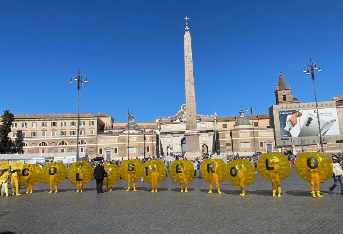 Nel cuore di Roma undici ingombranti sfere gialle “umane” bloccano il passaggio dei pedoni che transitano, esattamente come il colesterolo Ldl ostruisce la circolazione del sangue delle arterie, aumentando il rischio di infarto o ictus.